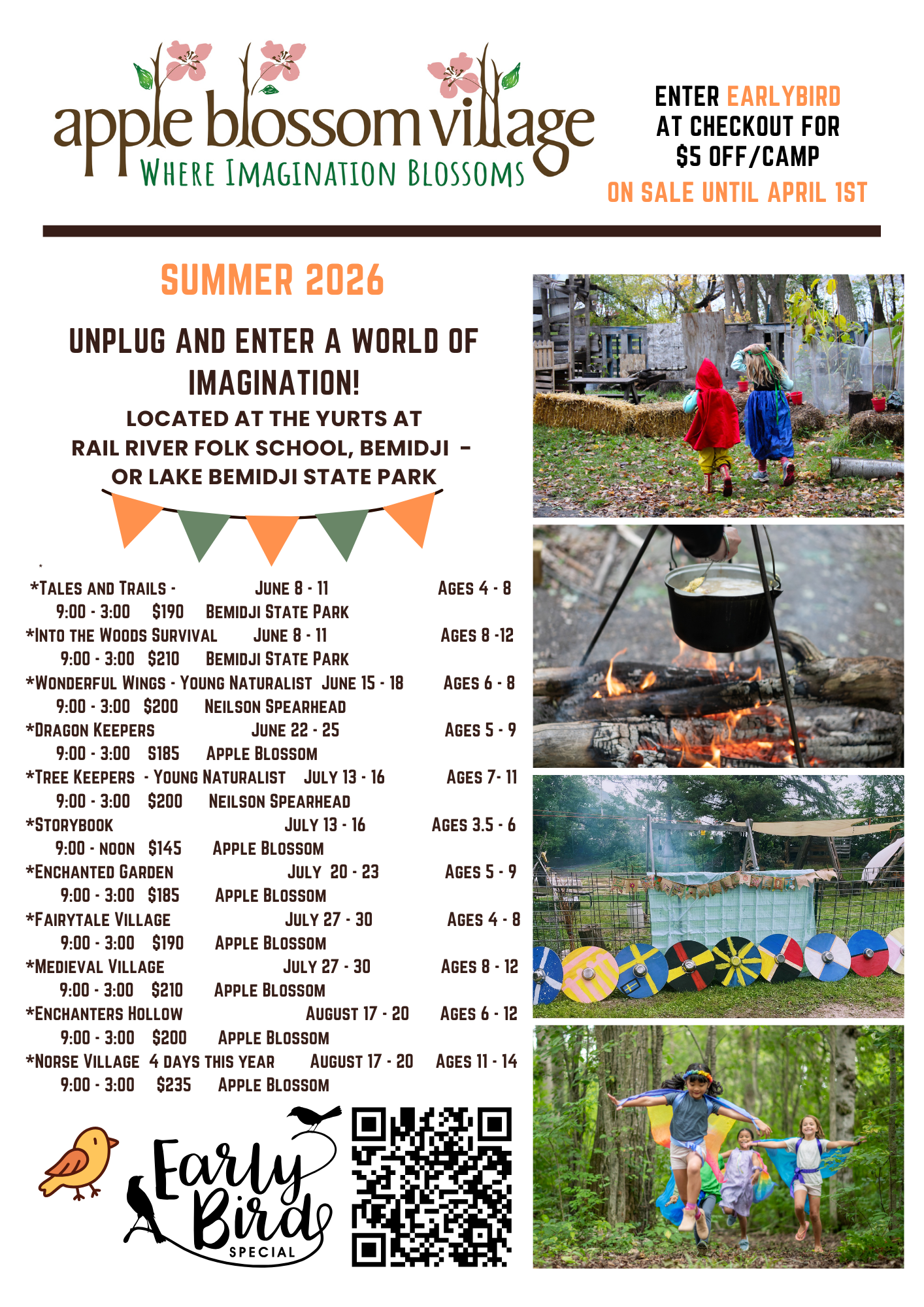 Get ready for an adventure filled week with hands on activities and life skills in the great outdoors. Our camps are immersion camps. Kids get immersed in nature and in the imaginative storyline. Please choose a camp week when your child does not have other scheduled activities so they can fully immerse themselves in the theme. Most of our Camps are offered 9 am - 3 pm, Monday - Thursday.